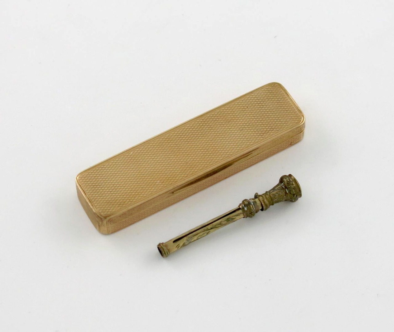 rectangular form, engine-turned decoration, plain thumb-piece, plus a gilt metal retractable tooth pick, approx. weighable 17.5g. (2)
