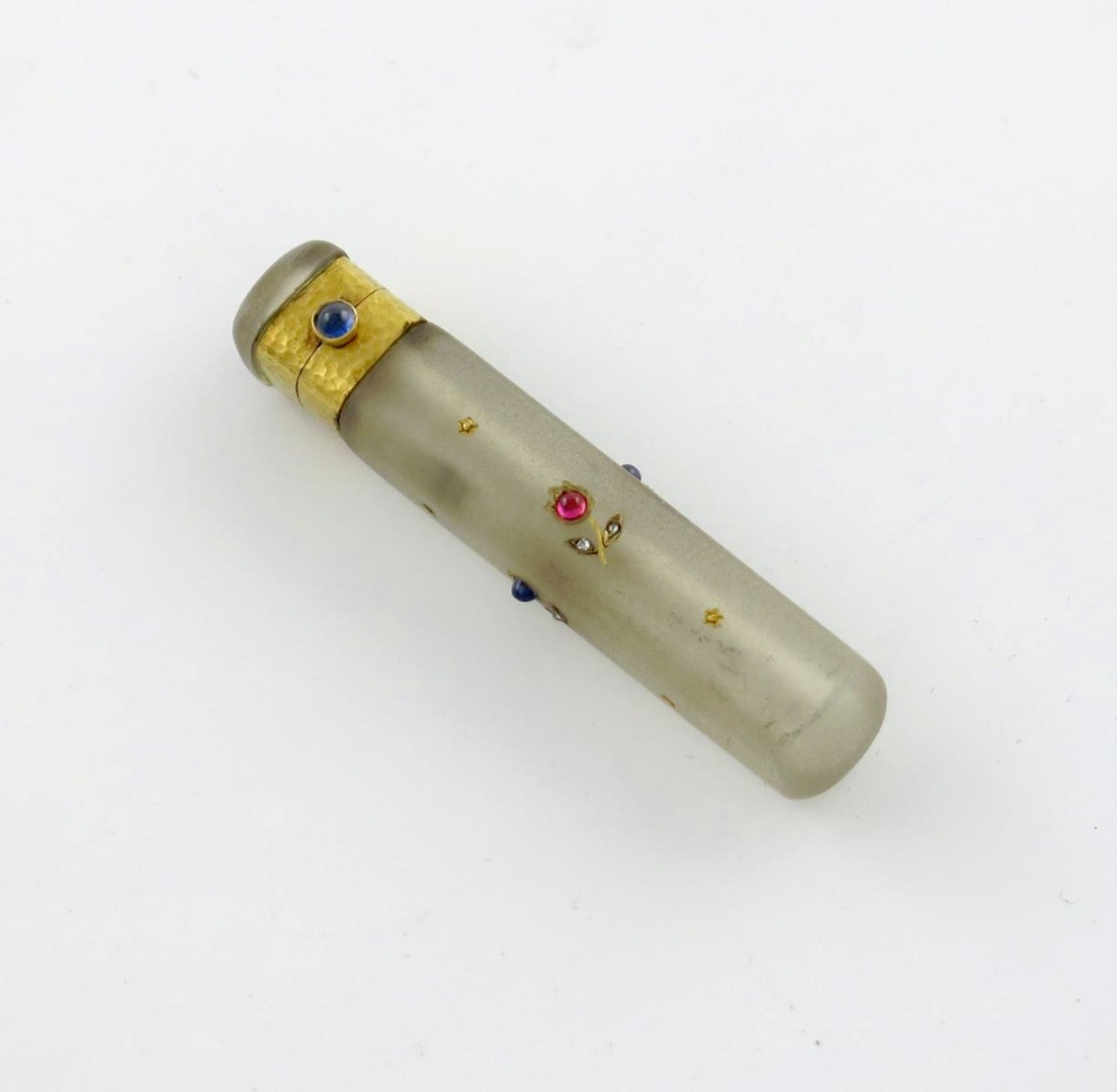 rectangular form, frosted glass body, the mounts with textured decoration, set with diamonds, rubies and sapphires, hinged cover, length 6.8cm.