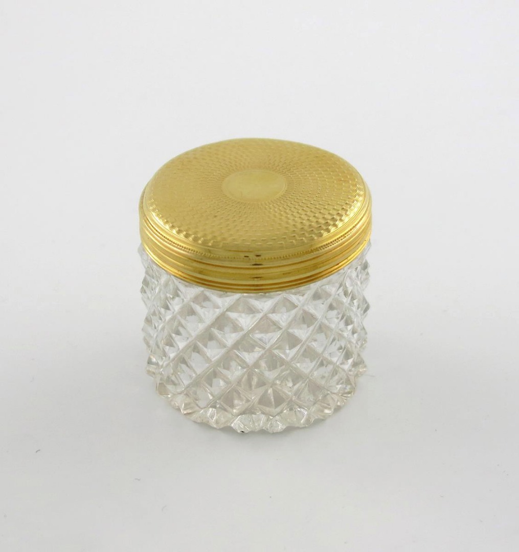 circular form, hob-nail cut decoration, the pull-off cover with engine-turned decoration, height 3.5cm, approx. weighable 10g.