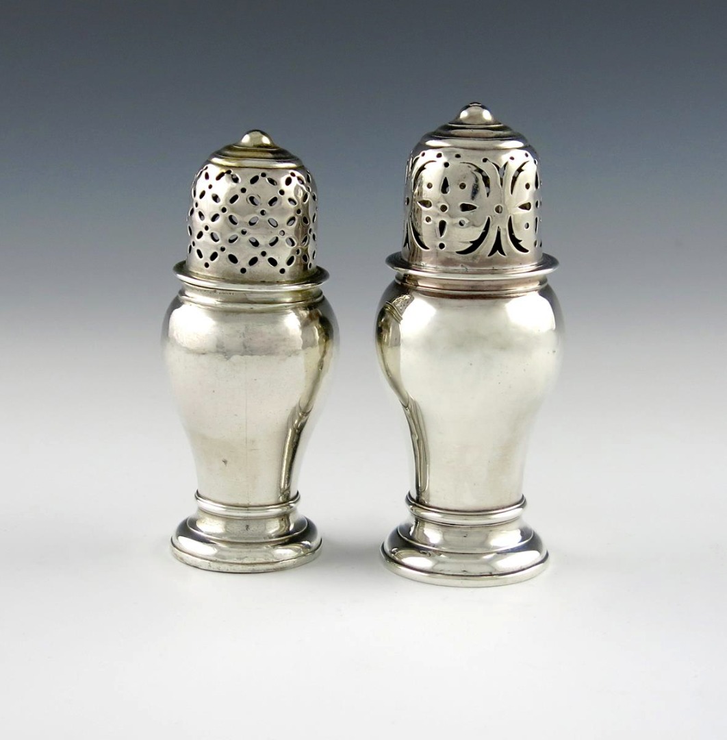 inverted baluster form, pull-off pierced cover, on a circular foot, later initialled to underside of the base, height 11cm, plus another 18th century Exeter silver caster of similar form, with traces of gilding, maker's mark only, partially rubbed ?S, possibly Pentecost Symons, of Plymouth, height 10cm, approx. total weight 5.4oz. (2)