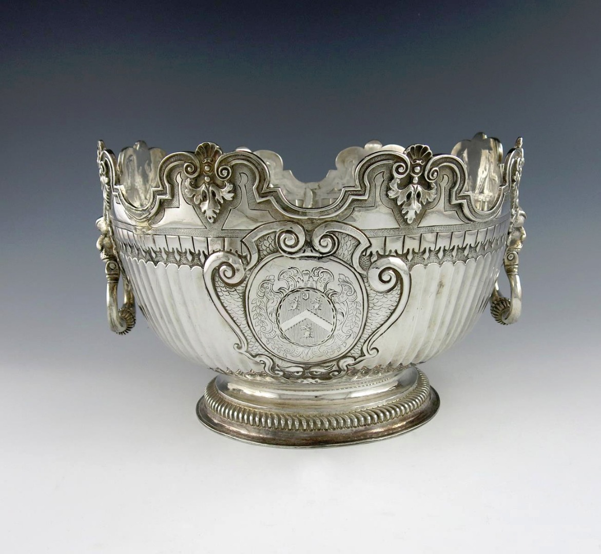 circular form, fluted decoration, castellated foliate and scroll border, lion mask drop ring handles, on a raised circular foot with a rope-work border, engraved with an armorial within foliate scroll mantling, diameter 30cm, approx. weight 55oz.