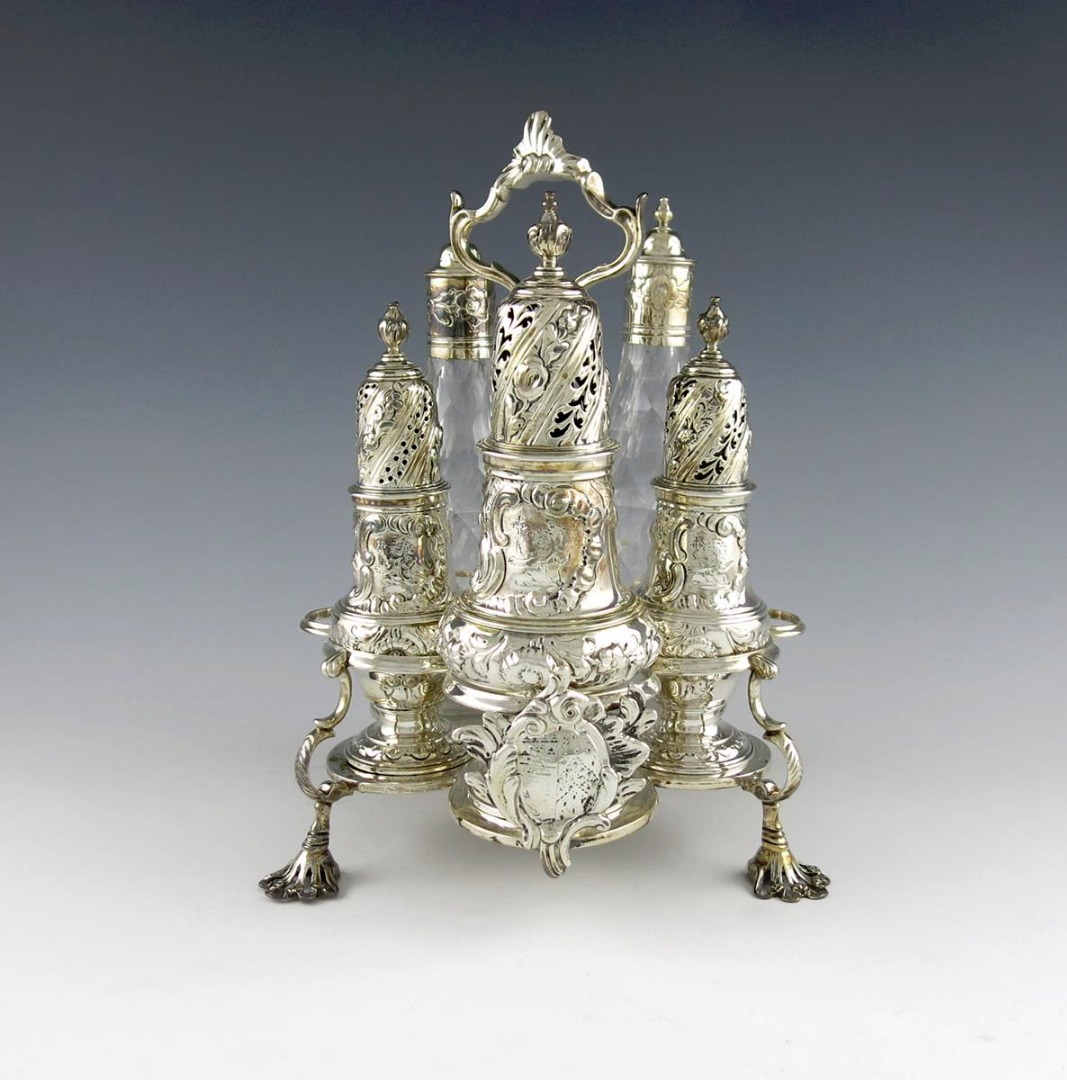 A George III silver Warwick cruet frame