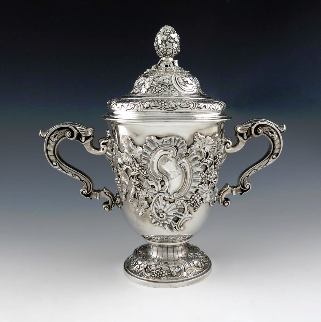 circular form, leaf capped scroll handles, applied with scroll, rocaille and trailing grapevine decoration, the pull-off cover with a cone shaped finial with grapevine decoration, on a raised circular foot, engraved with a crest, on a later wooden stand applied with a plaque, inscribed 'Anniversary Cup, Sandown, 1937, Won by Lord Hurst's Magnet', height off plinth 30.5cm, approx. weight 76oz. (2)