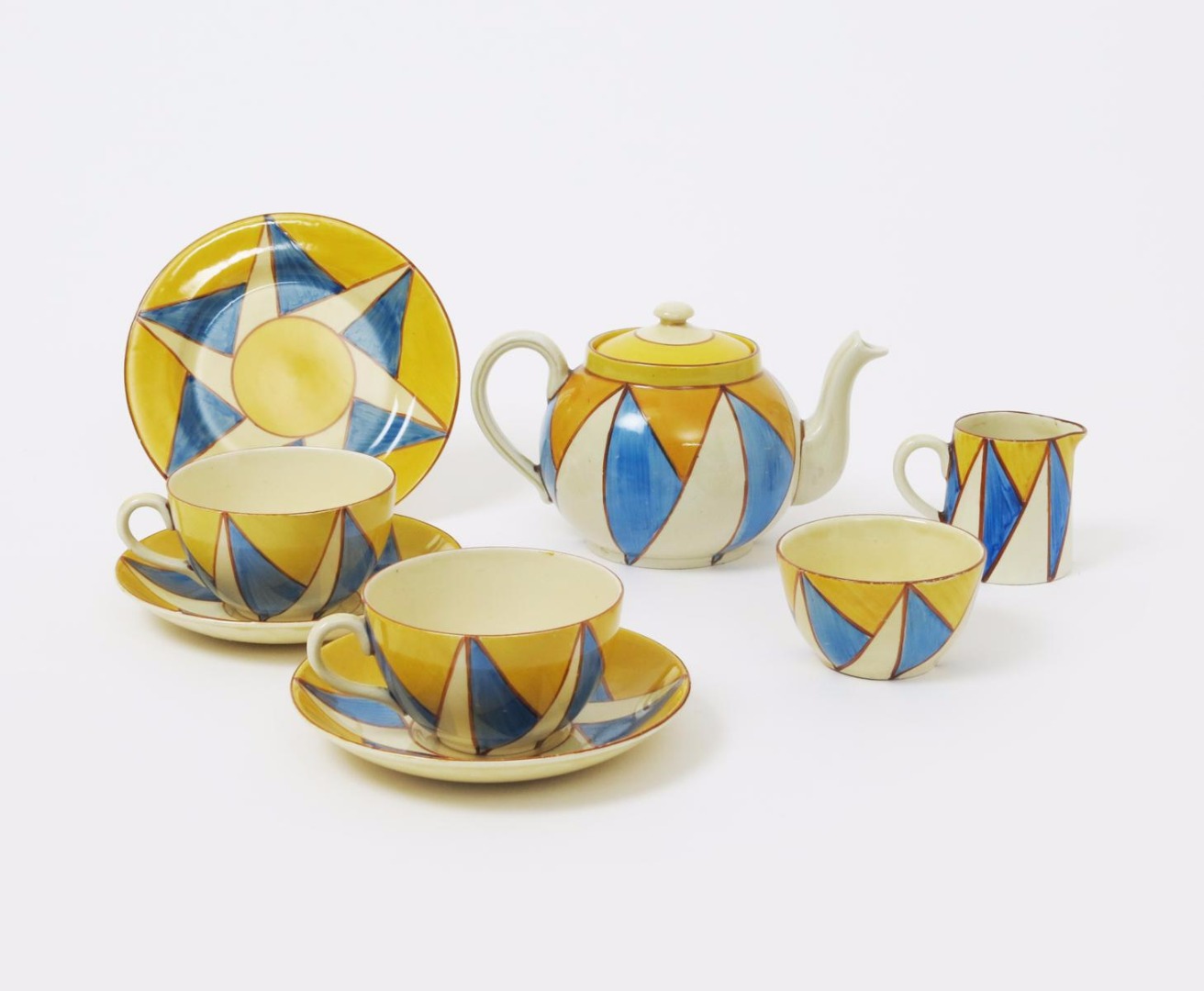 'Original Bizarre' a Clarice Cliff Globe tea for two, painted with blue and yellow triangles, outlined in orange, comprising teapot and cover, milk-jug and sugar basin, two cups, saucers and a side plate printed factory marks, 11cm. high (9)