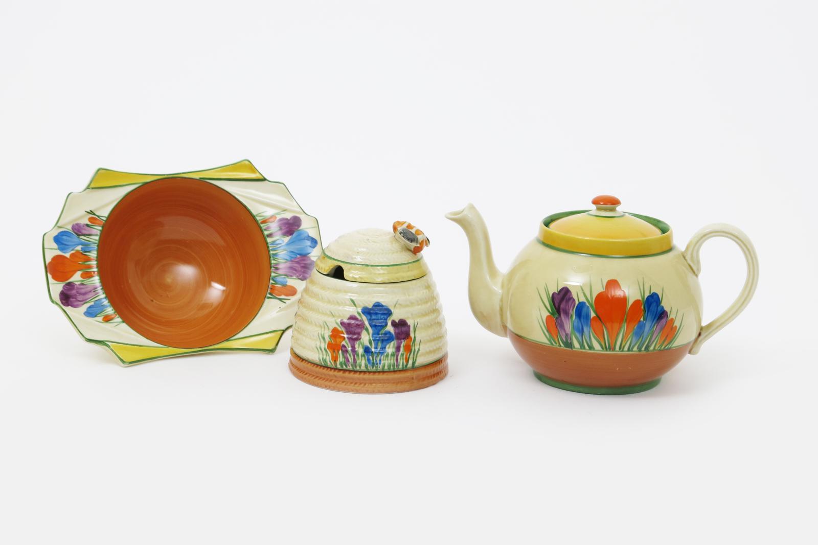 'Crocus' a Clarice Cliff Bizarre Beehive Honeypot and cover, painted in colours, a Globe teapot and cover, and a Grapefruit bowl, printed and painted marks 9.5cm. high (3)