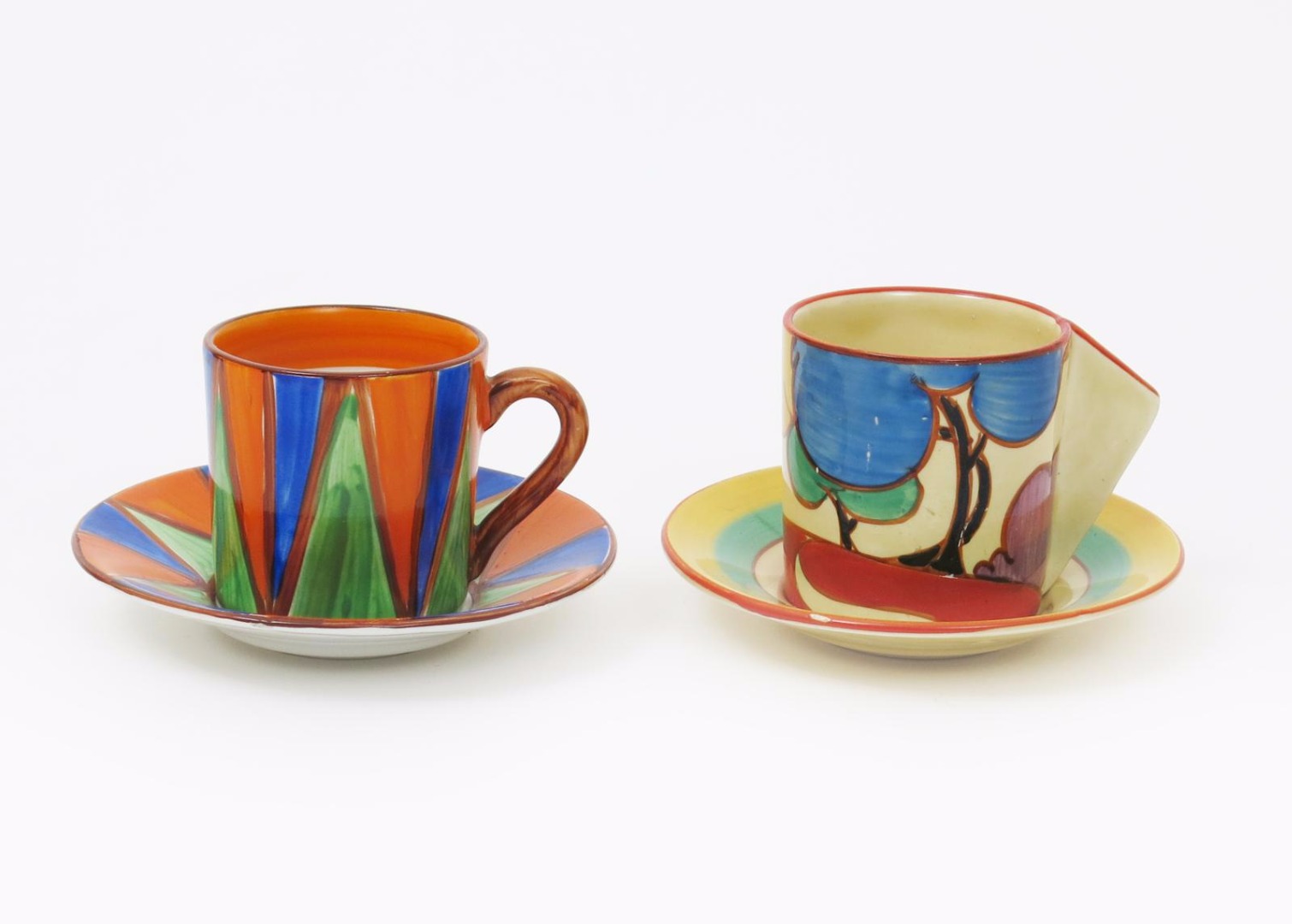 'Autumn' a Clarice Cliff Fantasque Bizarre Conical coffee can and saucer, painted in colours and an 'Original Bizarre' Tankard coffee can and saucer printed marks, 7cm. high (2)