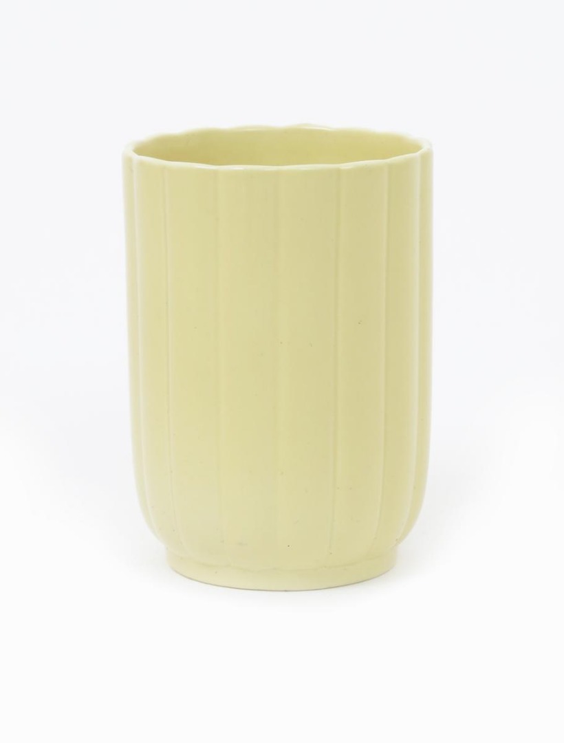 A Wedgwood earthenware beaker vase designed by Keith Murray, fluted cylindrical form, covered in a Straw glaze printed factory mark, KM monogram 11cm. high