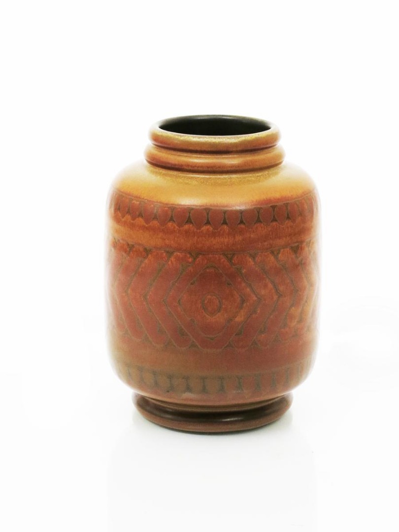 A Boch Freres Gres Keramis vase designed by Charles Catteau, pattern E.2466, barrel form, decorated with a chevron band in brown on a rust coloured ground impressed, printed and painted marks, hand painted signature 20cm. high