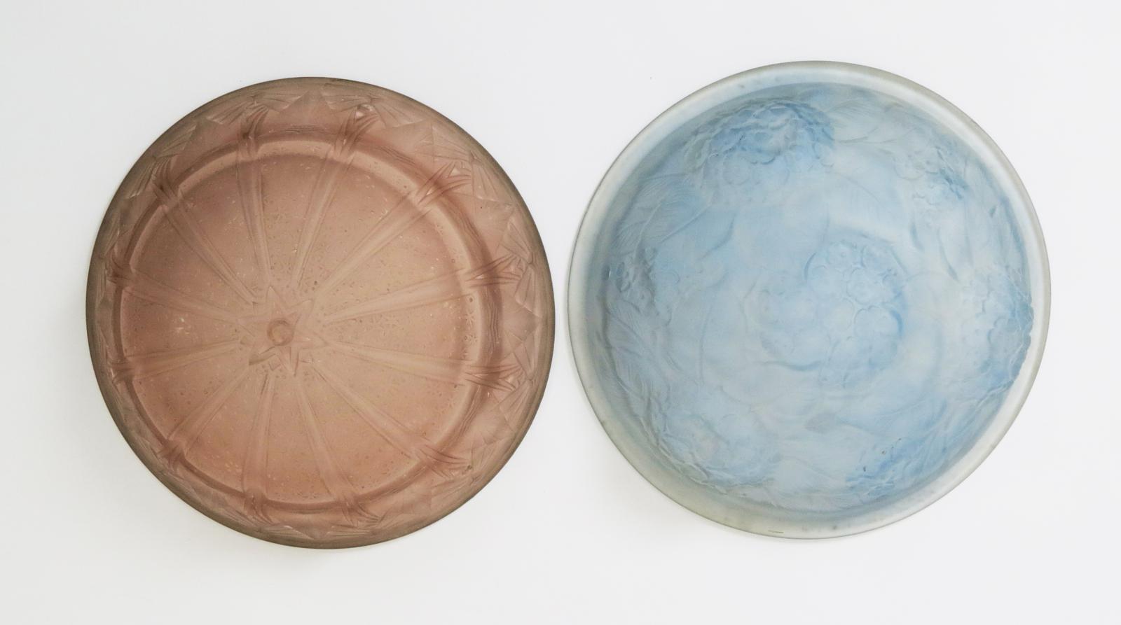 An Artistar French moulded glass plaffonier, pale blue glass moulded with hydrangea flowerheads, and another rose glass moulded plaffonier cast signature to the rim, 34.5cm. diam. (2)