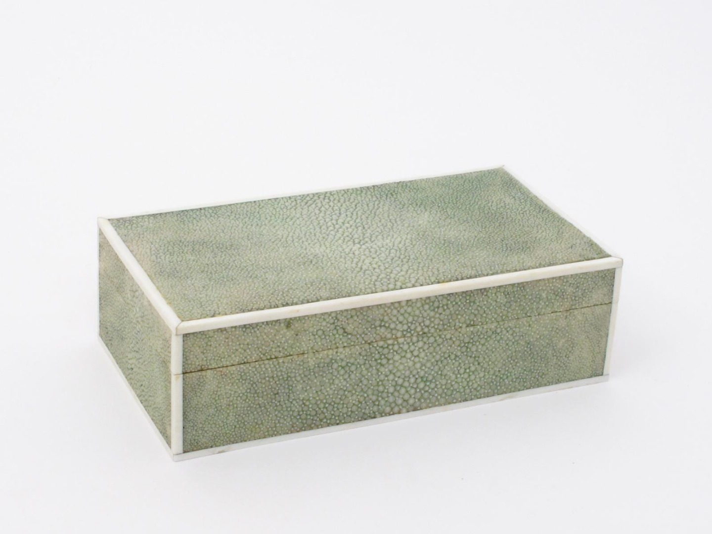 λ An English shagreen mounted cigarette box, satinwood rectangular carcass with hinged cover, mounted with ivory border, with internal divider, stamped London to one hinge 19.5cm. wide