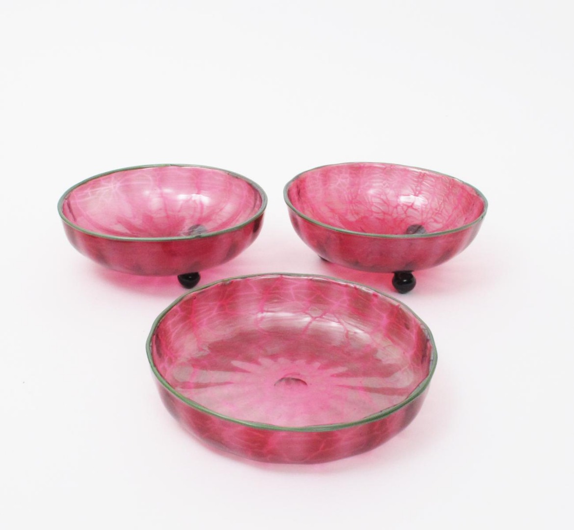 A pair of Loetz glass bowls on ball feet, mottled pink glass with mottled silver splashes, and applied green rim, with three applied black glass feet, and another en suite bowl unsigned 21cm. diam. (3)