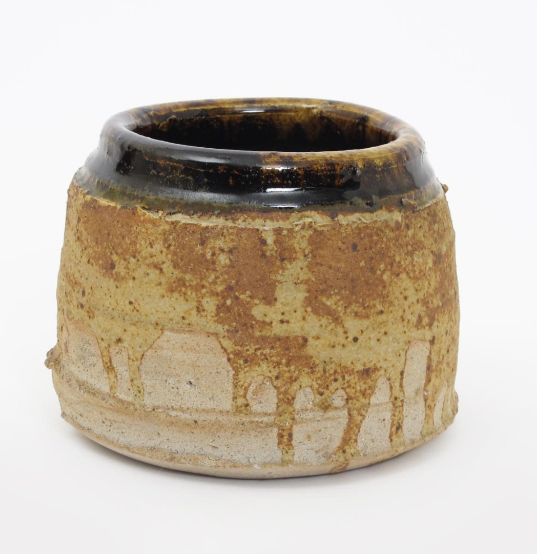a stoneware vase, tapering cylindrical form, the rim with tenmoku glaze, impressed seal mark, 13.5cm. high