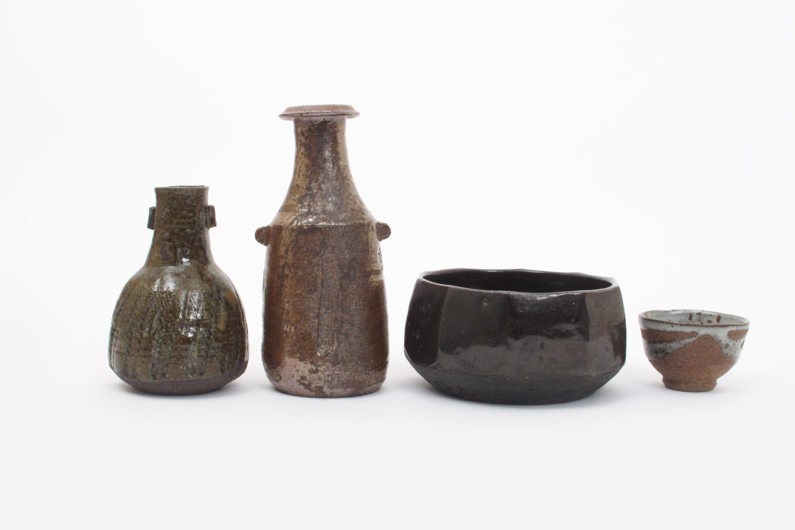 a Leach Pottery stoneware vase, shouldered form with cylindrical neck and lug handles, with impressed rope column repeat, partially glazed with an ash glaze, another taller and two Janet Leach bowls, impressed seal marks to all four items, minor frits, 13.5cm. high (4)