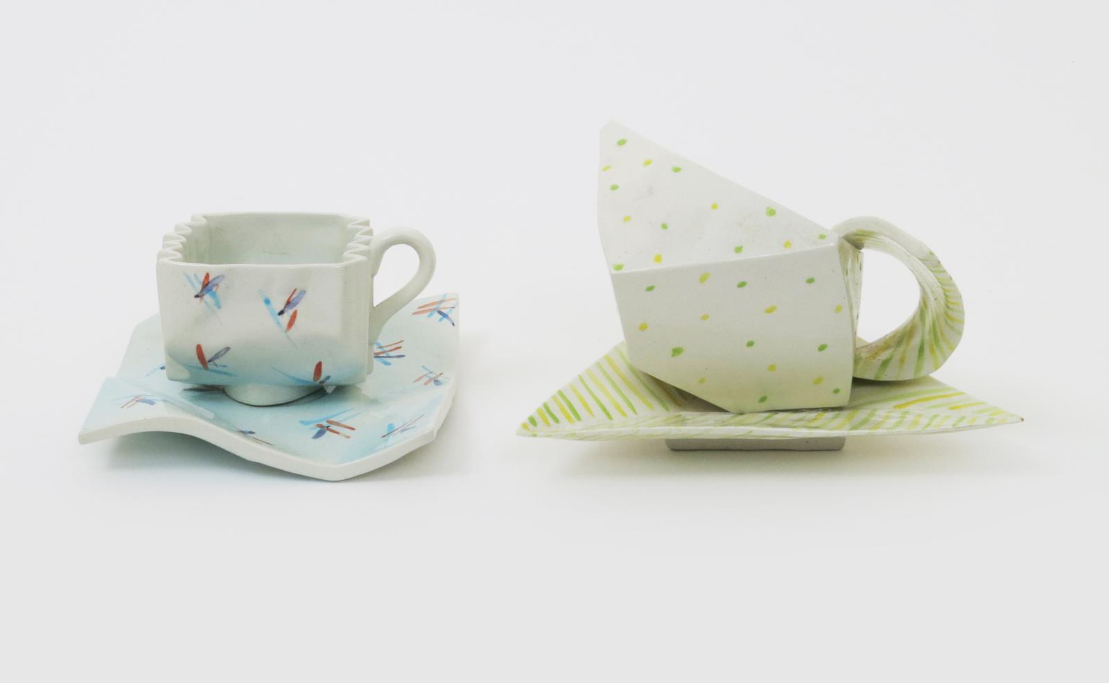 Carol McNicoll (born 1943) a cup form on triangular saucer