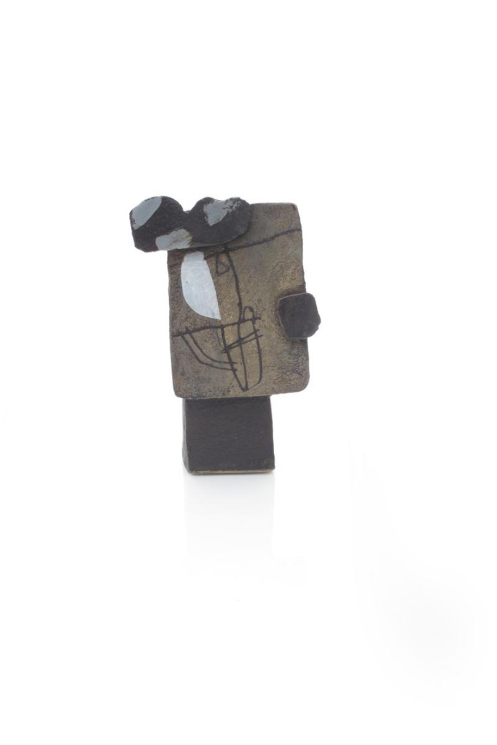 a slab built stoneware vase, with applied cloud and rock panels, the body painted with a fishing boat and moon design, painted Maltby, small nick to top rim, 23cm. high