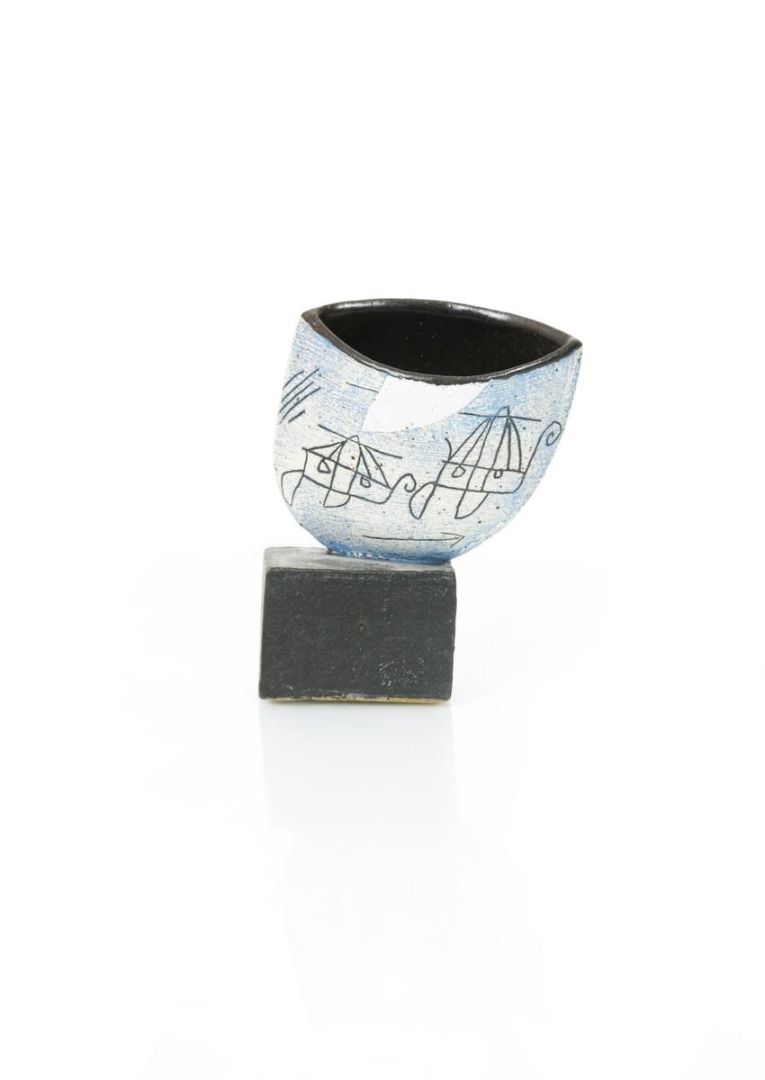 a stoneware cup form vase, enamelled with ships at sea, in white and brown on a blue ground, the angled vase on rectangular pottery base painted Maltby 17cm. high