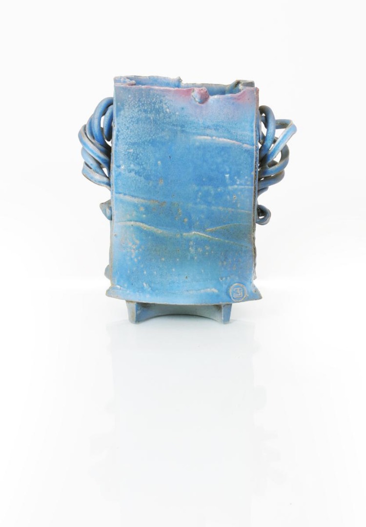 a stoneware winged pot, rectangular form, applied with entwined handles, covered in a pale blue and pink glaze impressed seal mark, 26cm. high