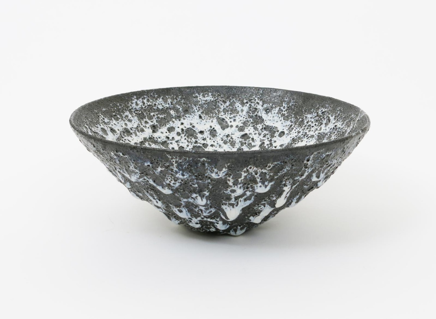 a stoneware flaring bowl, covered in a running, volcanic white glaze, impressed seal mark, applied paper exhibition label, 31.5cm. diam.