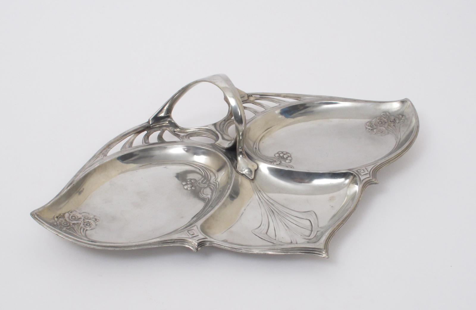 An Art Nouveau W.M.F pewter tray, trilobed form with central over-slung handle, cast in low relief with flowers, berried stems and secessionist strapwork, stamped marks to rim edge 45.5cm. wide
