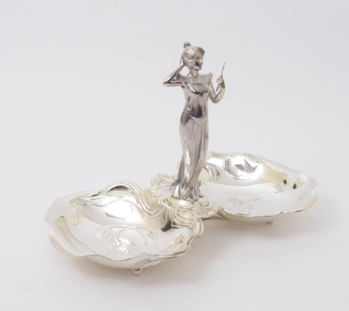 An Art Nouveau W.M.F polished pewter tray, twin bowl form on four ball feet, cast in low relief with sinuous foliage, mounted with central Art Nouveau maiden holding a hand mirror, stamped marks, 40cm. wide.