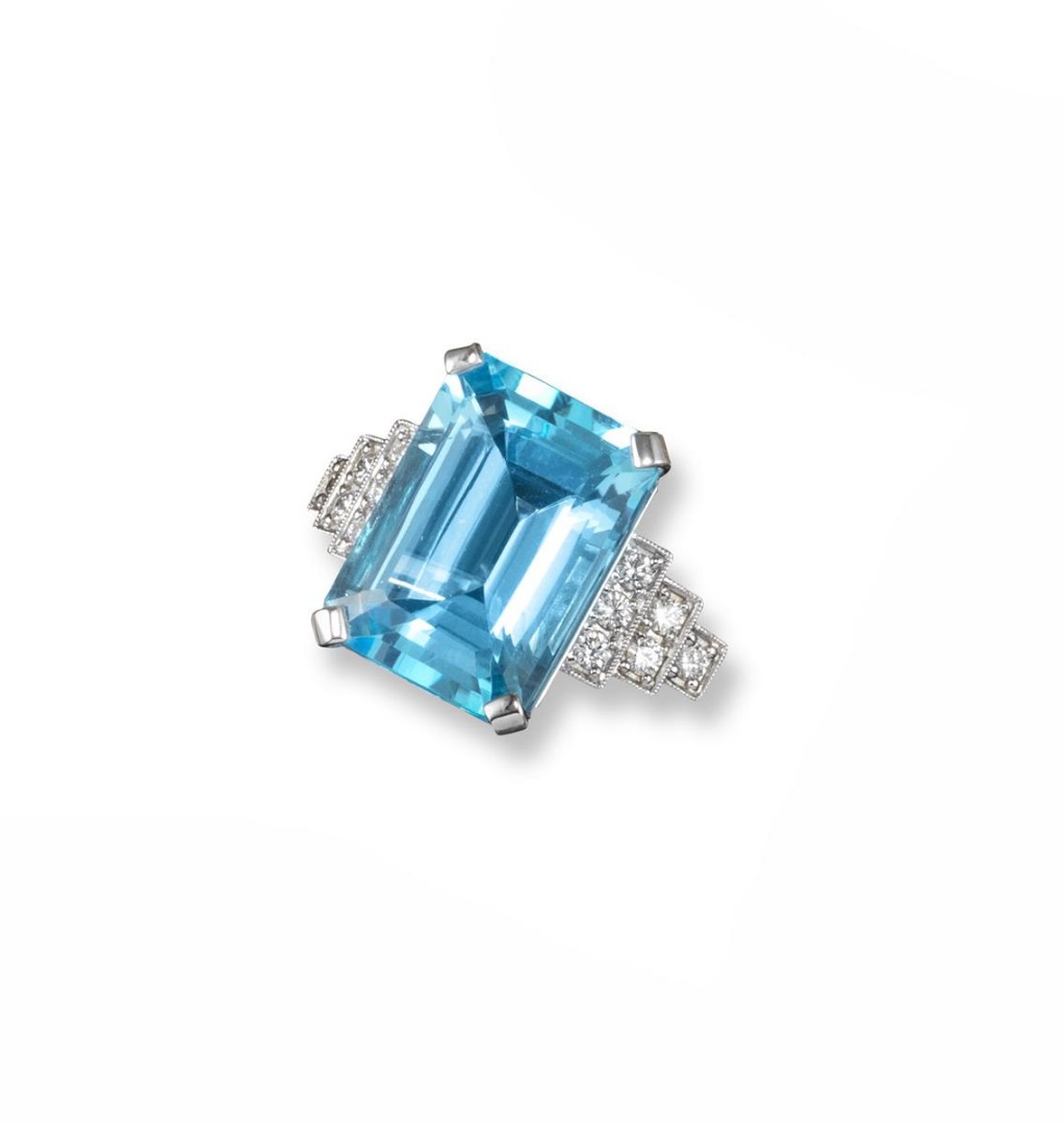 A large blue topaz and diamond set ring, the emerald cut topaz is millegrain set with six circular cut diamonds to each shoulder in 18ct white gold. Size Q.