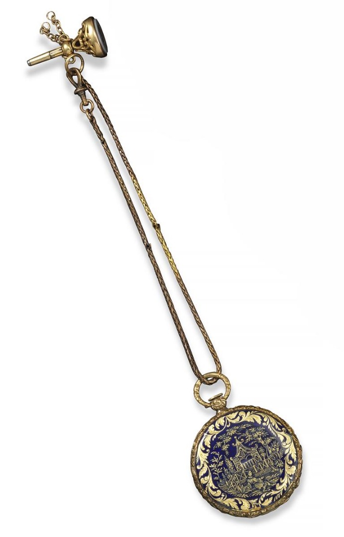 A lady's 19th century open faced key-wind fob watch, centred with a scalloped guilloche pattern and with black Roman numerals. The reverse with blue enamel Chinoiserie scene within foliate scroll borders. 3.5cm wide. With fine link chain and watch key incorporating a chalcedony matrix seal carved with a boar's head issuing from a Ducal coronet.