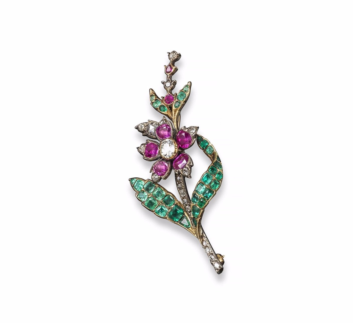 An early 19th century gem-set foliate brooch, realistically formed as a flower sprig set with ruby petals, diamonds and emerald leaves. In closed-back silver and gold mount. 6.5cm long.