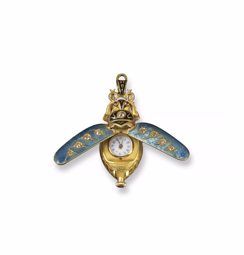 An early 20th century gem set gold and enamel insect watch pendant, realistically formed, the hinged folding wings set with graduated circular cut diamonds on light blue guilloche enamel ground. With black enamel decoration to the head and set with a circular cut diamond and ruby eye. Stem wind movement, white circular dial with blue Arabic numerals and red '12'. 4.5cm long. With a gold fine link chain mounted with blue guilloche and white enamel cylinder links. The chain 56cm.