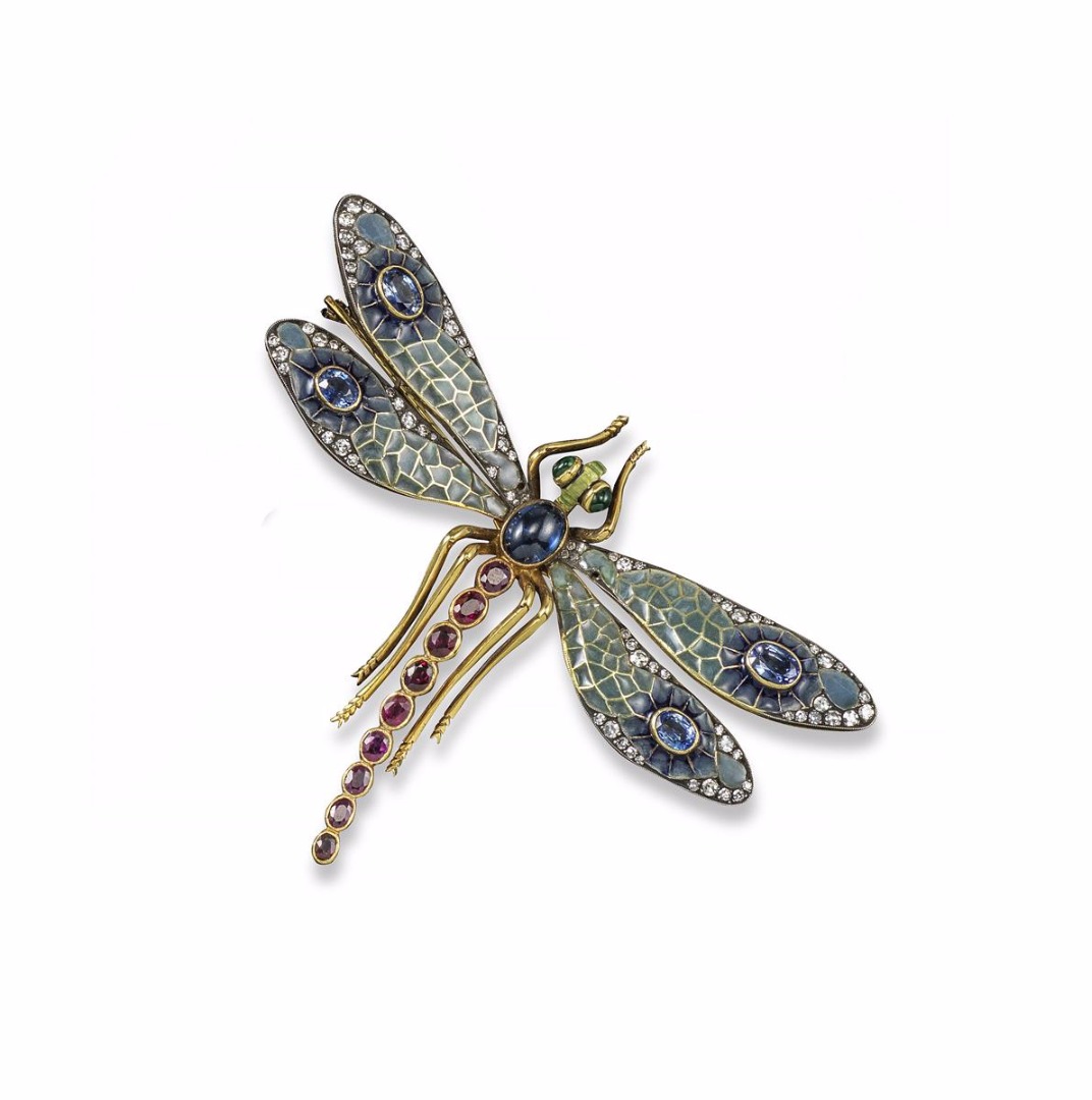 A dragonfly brooch, each plique-à-jour enamel wing set with an oval shaped sapphire and with emerald eyes, cabochon sapphire body and line of graduated oval-shaped garnets. 9cm wide.
