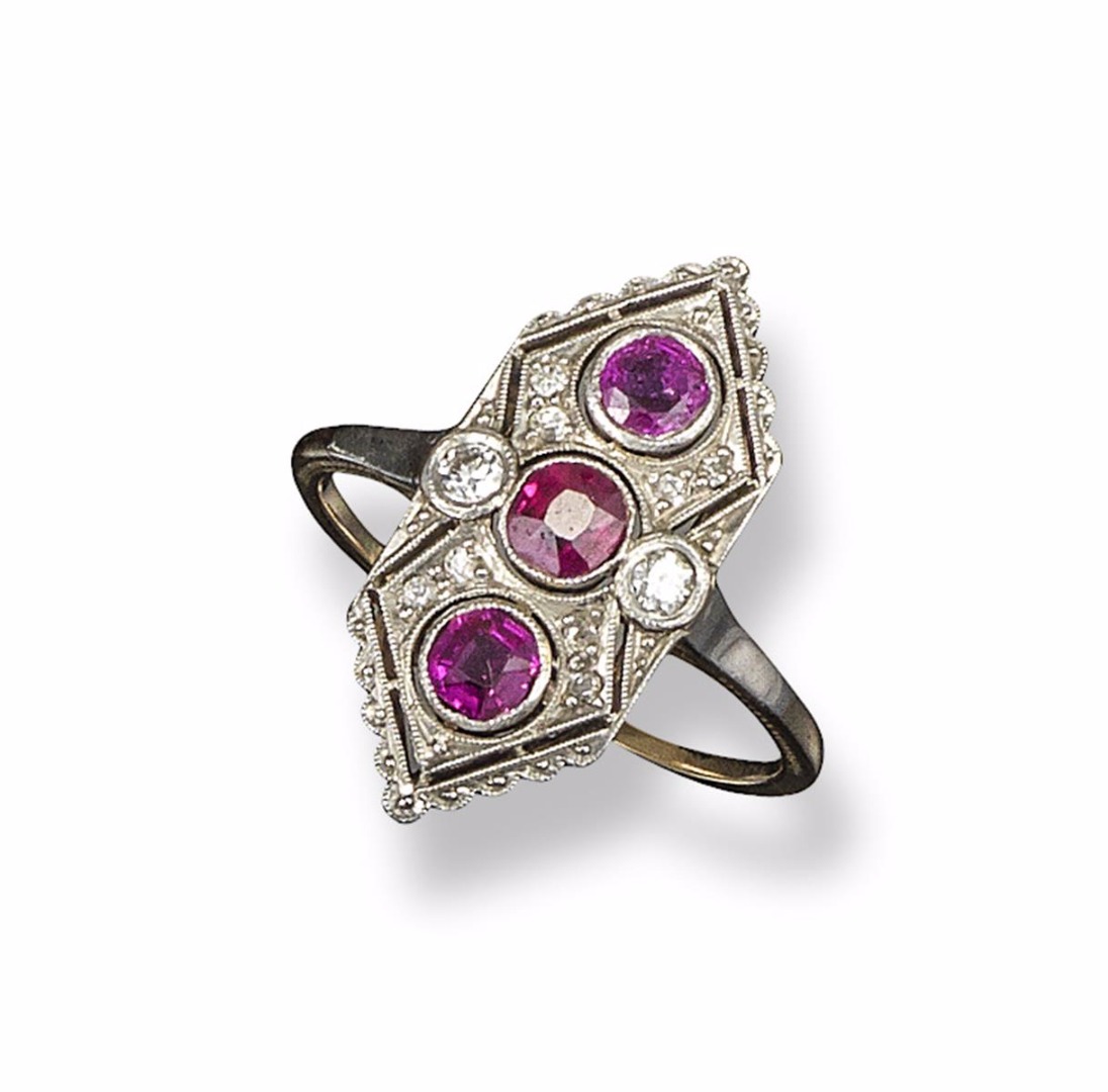 An early 20th century ruby and diamond lozenge-shaped ring, the elongated hexagonal-form ring is millegrain-set with three cushion-shaped rubies within carved and pierced diamond mount. Set in platinum and yellow gold. Size P 1/2.