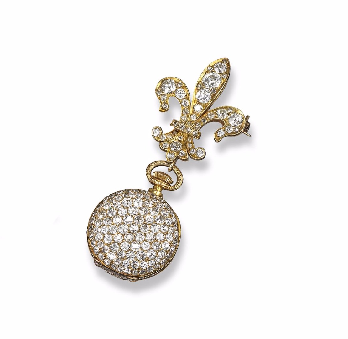 A lady's diamond-set lapel watch by Tiffany & Co, circa 1900. The watch with white enamel dial and black Arabic numerals, signed Tiffany & Co, New York, the case pave-set with circular-cut diamonds in yellow gold. On spinning suspension ring which hangs from a graduated circular-cut diamond gold fleur-de-lys brooch. 6.2cm long. In case by Catchpole & Williams, 14 Grafton Street.