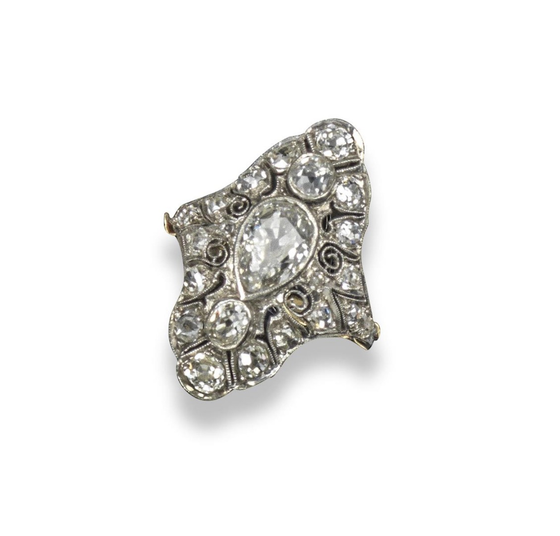 An early 20th century navette-shaped diamond cluster ring, set with a central pear-shaped diamond which weighs approximately 1.15cts within carved and pierced millegrain-set diamond surround in platinum. Size Q 1/2.