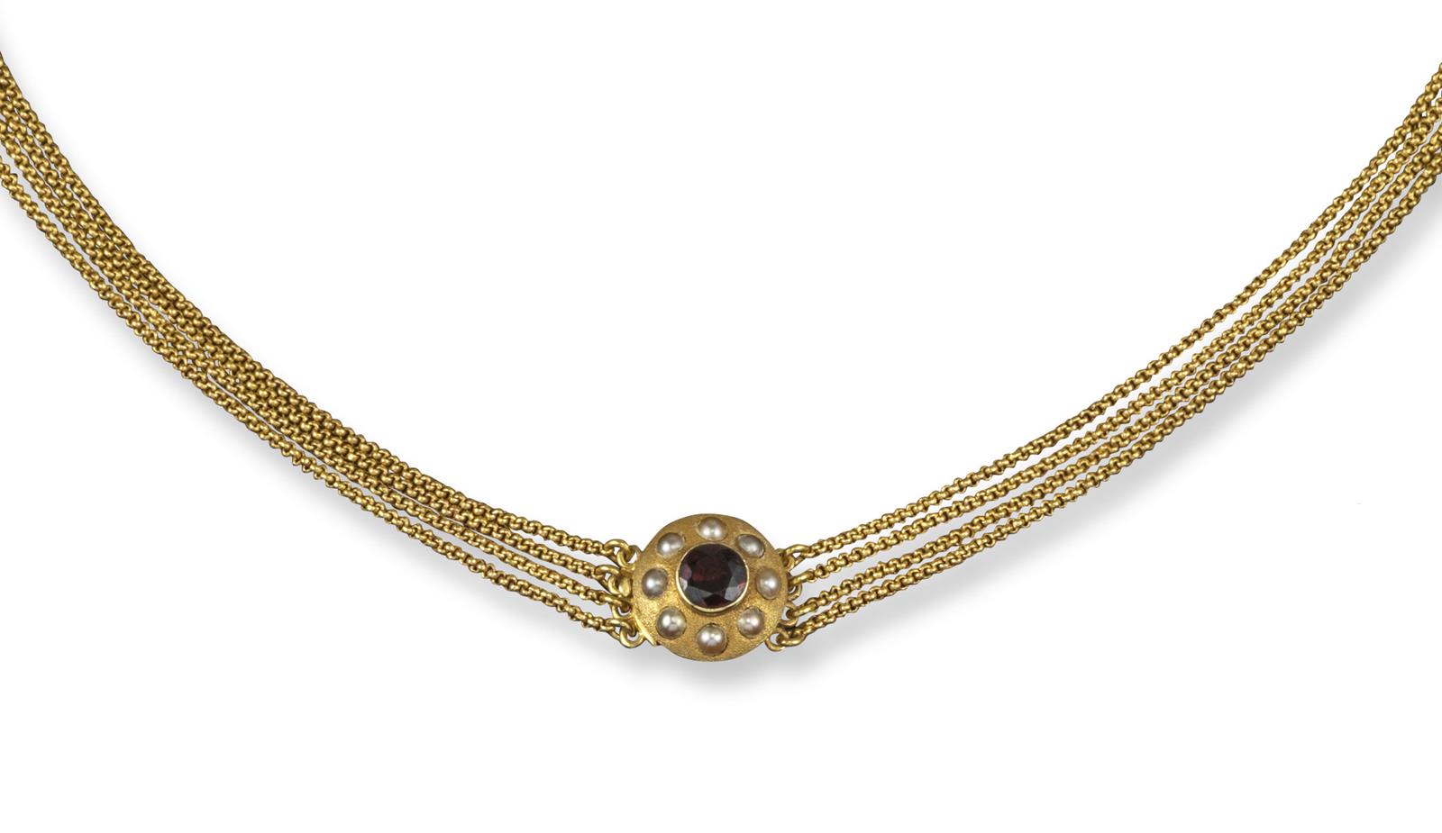 A 19th century gold necklace, the four fine-link gold chains set with a garnet and seed pearl target clasp. 44cm long.