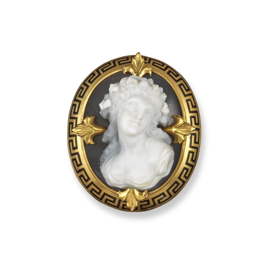 A late 19th century hardstone cameo mounted gold brooch, depicting a lady in the classical manner carved in agate, within quartrefoil fleur-de-lys border and black enamel and gold mount. 4.5cm high.