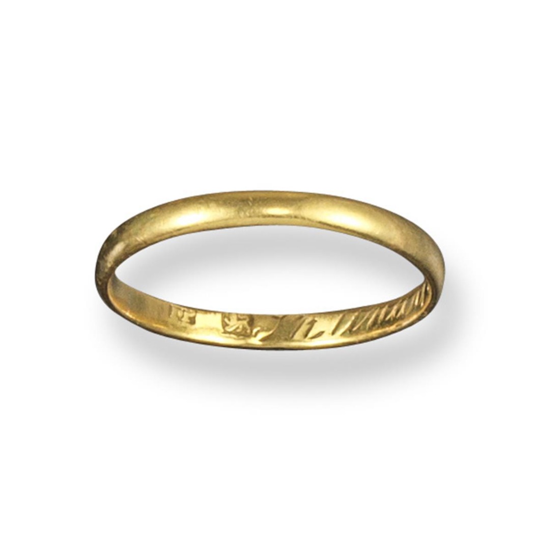 An 18th century gold posy ring, engraved indistinctly to the interior, probably 'In unity lets live & die'. Marked with a lion passant and indistinct initials, possibly IP. 1.7g, size O.
