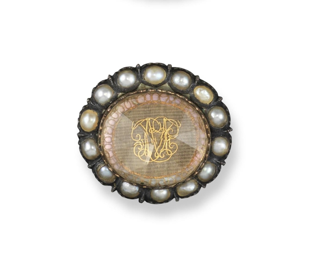 A Stuart crystal memorial ribbon slide circa 1680, centred with gold wirework initials on a plaited hair ground beneath rose cut rock crystal. Within a surround of pearls. With red and white foliate counter enamel which reads M.F Desember y.25 1655. 2.6cm wide. Case.
