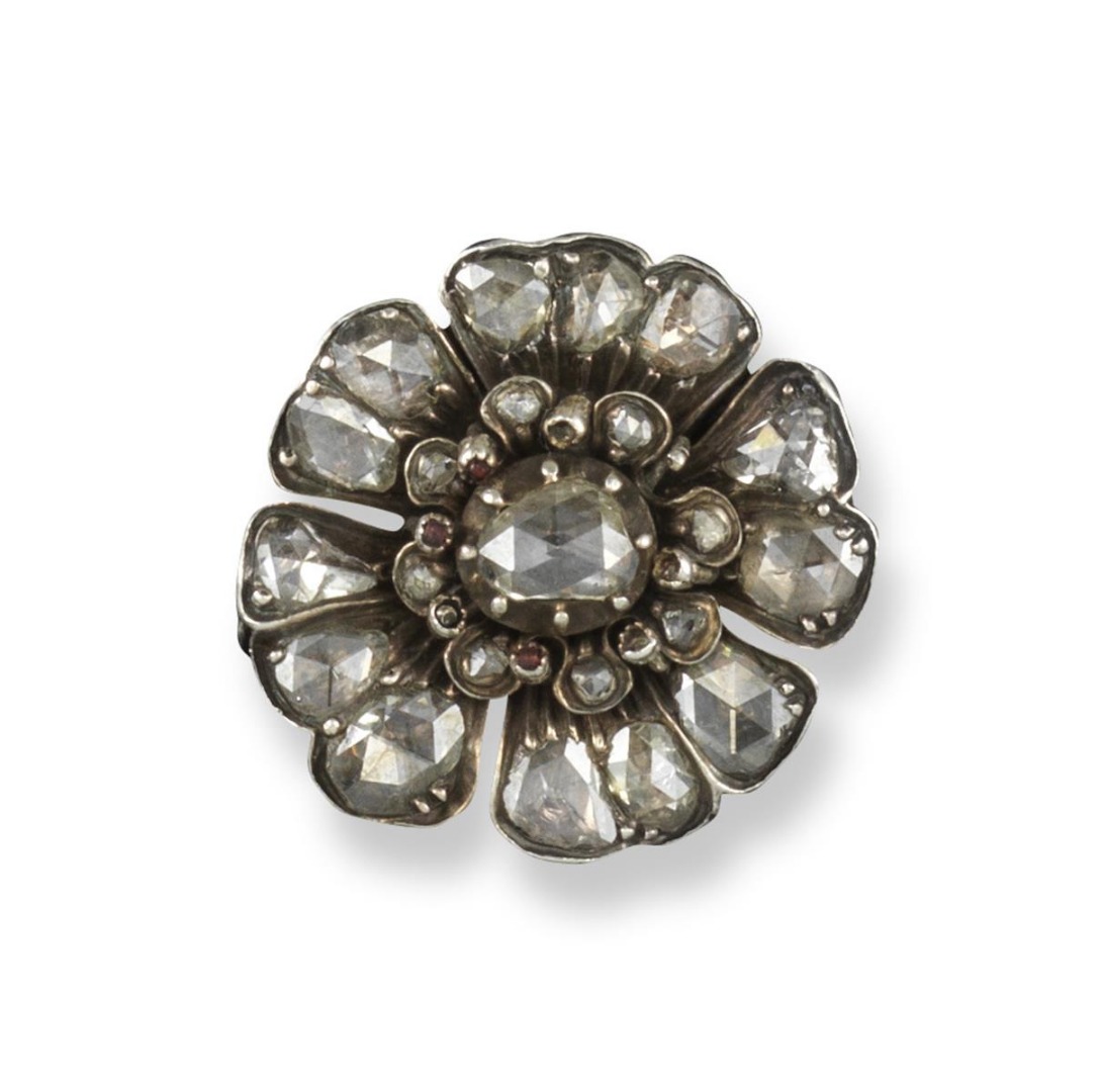 An 18th Century diamond flower head brooch, realistically designed and set with rose-cut diamonds in closed back silver and gold mount. 2.7cm wide.