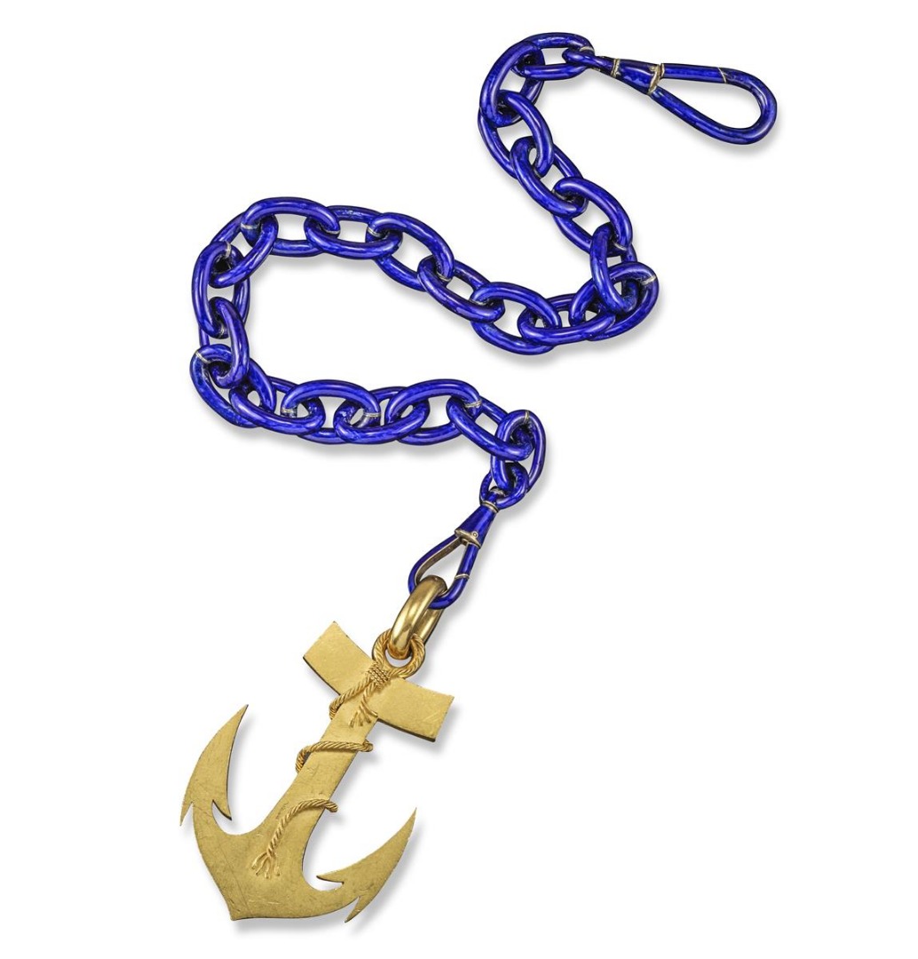 A realistically formed late 19th century gold fouled anchor pendant with a blue enamel and gold...