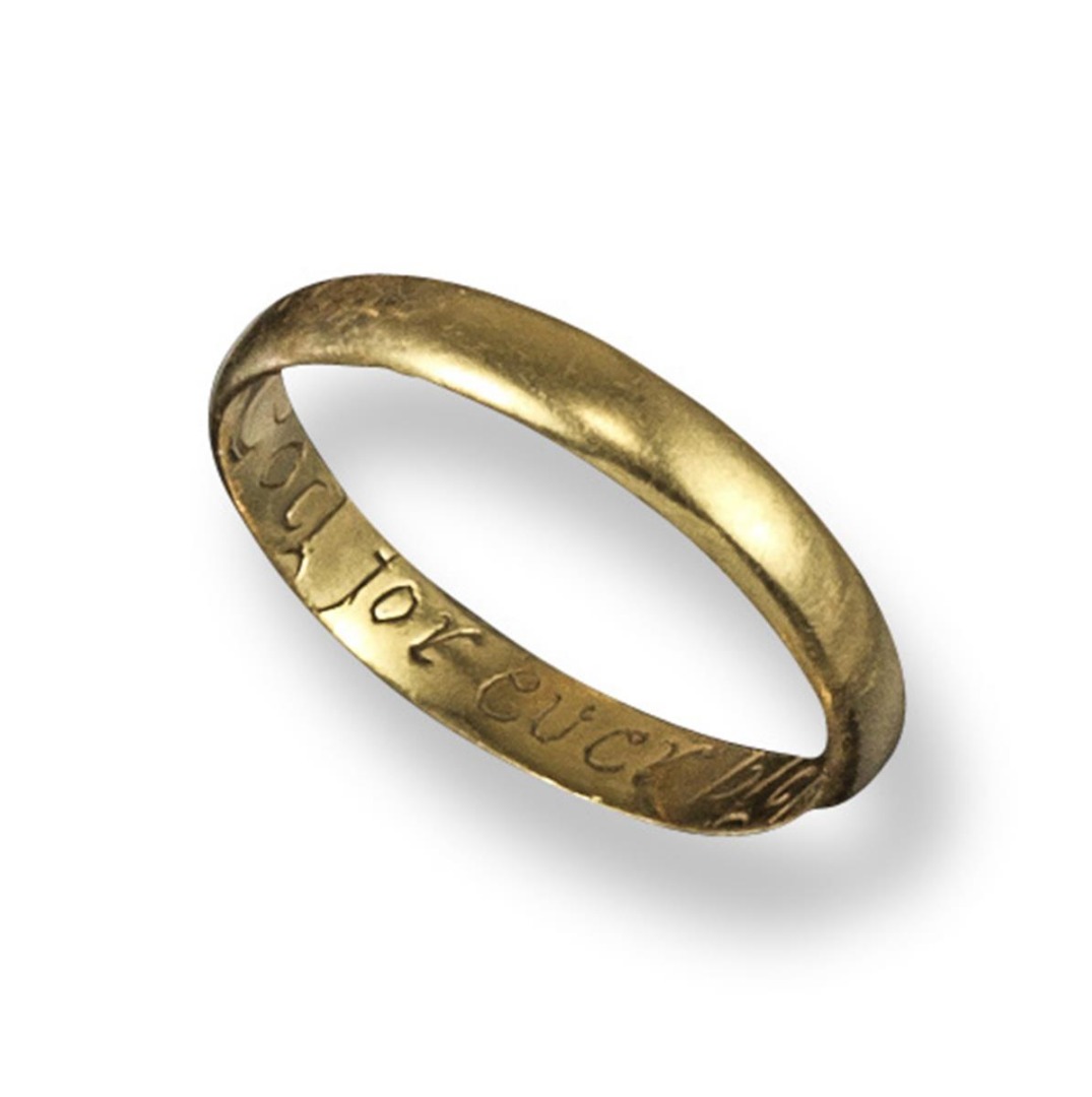 An 18th century gold posy ring, engraved to the interior 'God forever bless us together'. Marked with initials, probably RN. 1.9g, size M.