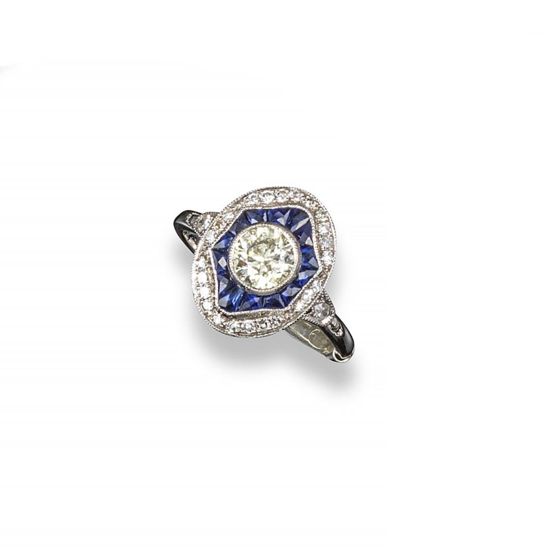 A sapphire and diamond cluster ring, the circular-cut diamond is set within a surround of calibre-cut sapphires and circular-cut diamonds in white gold. Size N (with inner re-sizing sleeve)