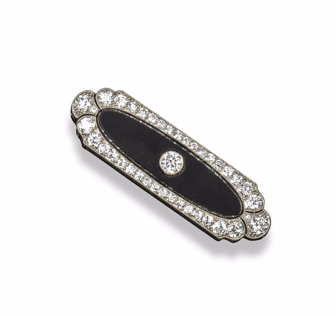 An Art Deco onyx and diamond brooch