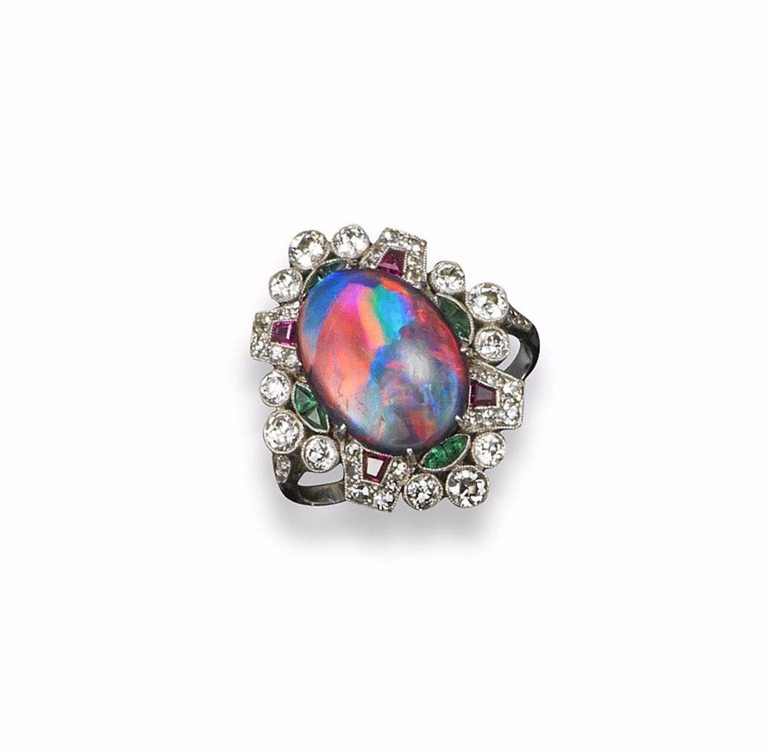 An Edwardian opal and gem set cluster ring, the oval-shaped solid black opal is set within a surround of graduated circular cut diamonds, baguette-shaped rubies and triangular-shaped emeralds millegrain set in platinum. Size M½.