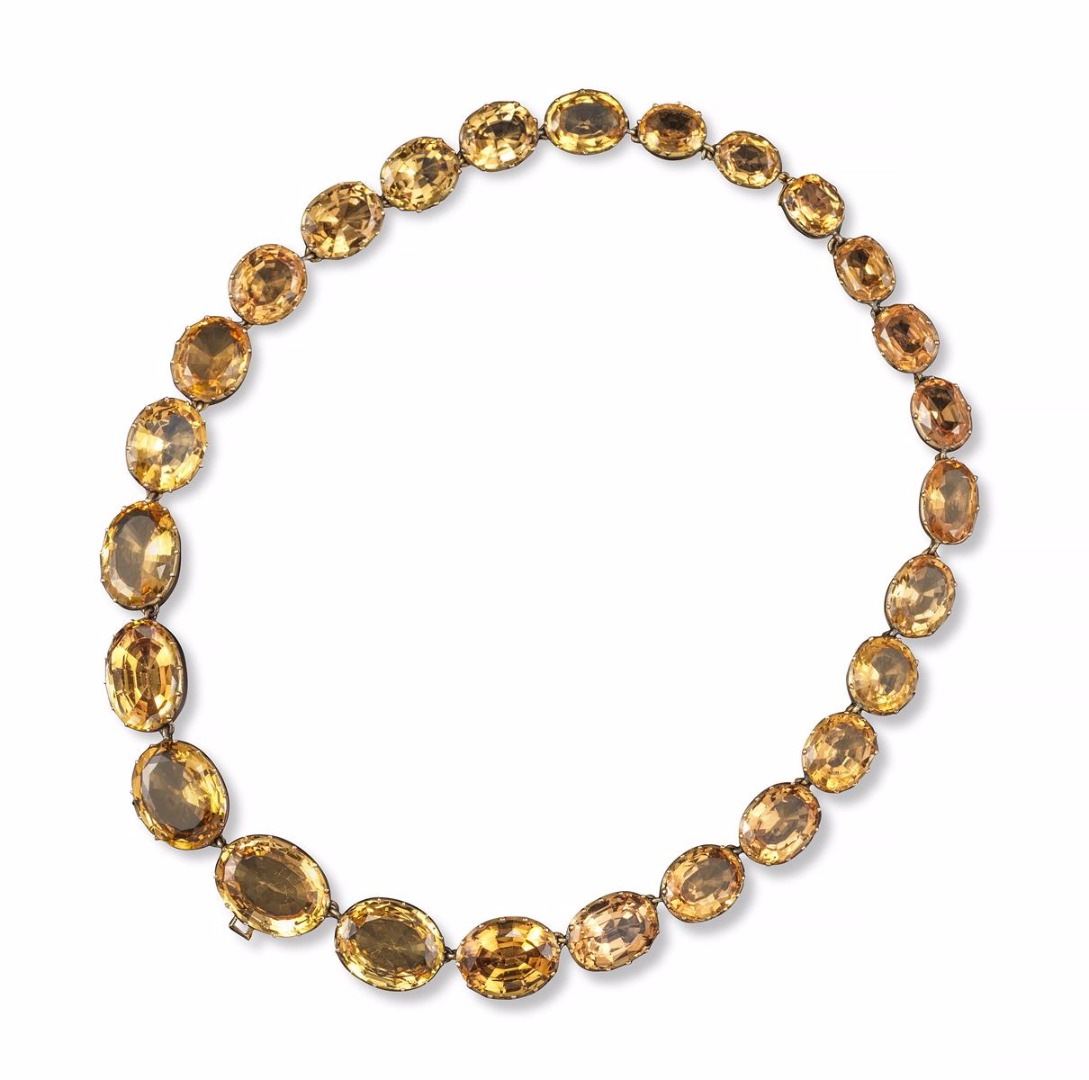 A 19th century topaz rivière necklace, the graduated oval-shaped orange topaz are set in gold cut-down collets. 38cm long.