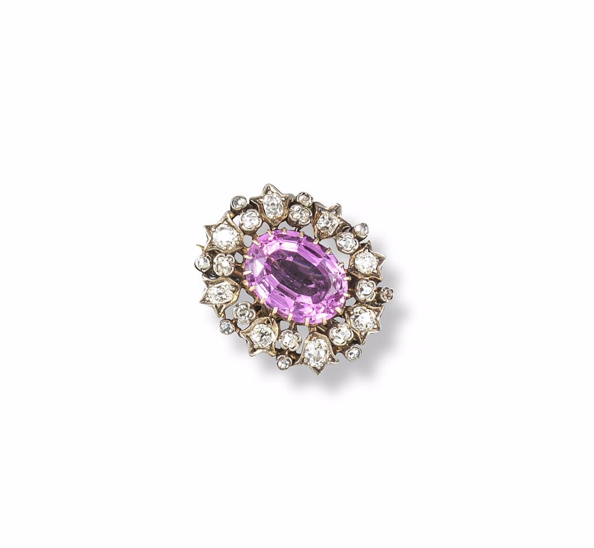 A Victorian pink topaz and diamond brooch, the oval-shaped pink topaz weighs approximately 5.30cts within foliate diamond-set surround, in silver and gold. 2.3cm wide.