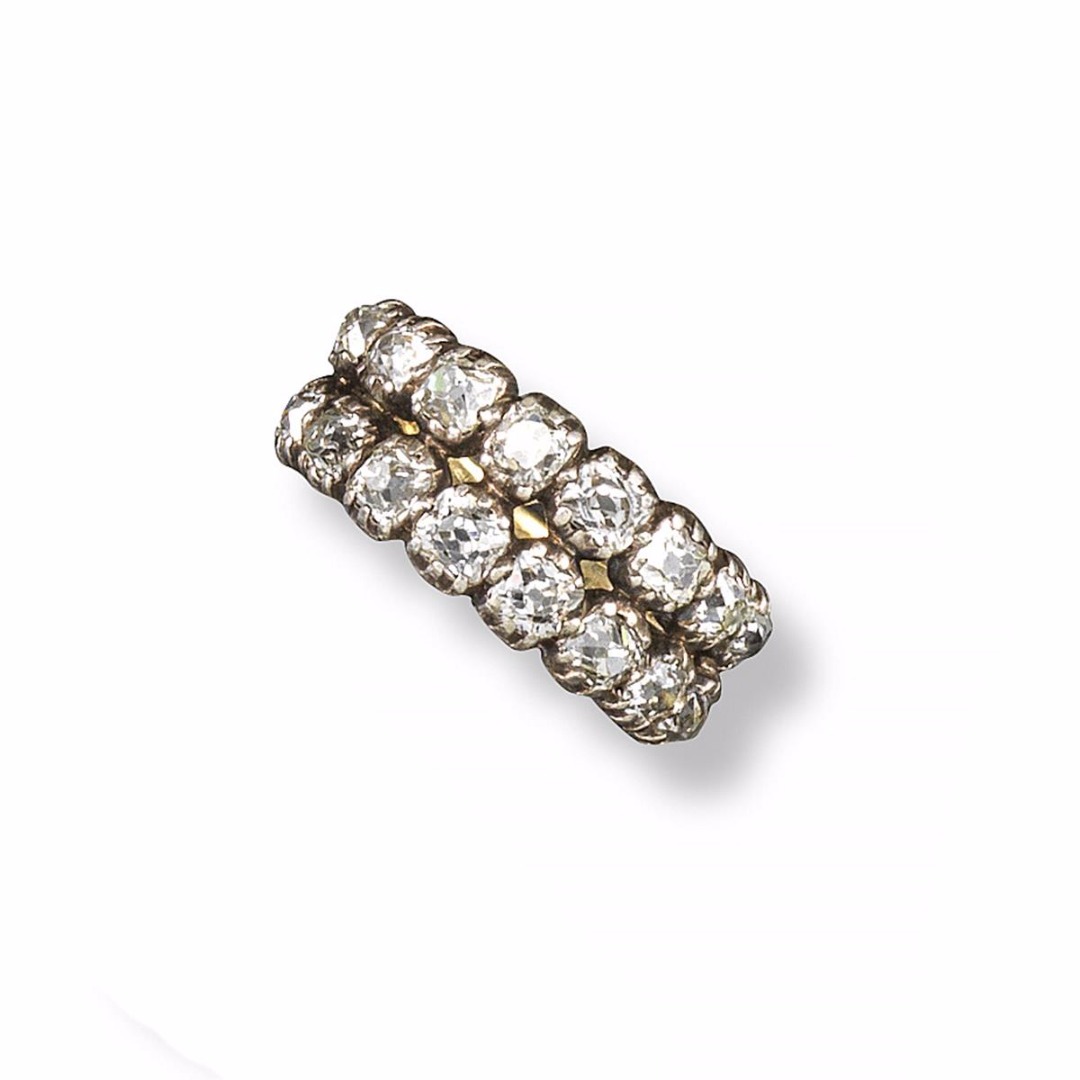 A 19th century diamond half hoop ring, the two rows of cushion-shaped diamonds are set in silver and gold. Size N 1/2.