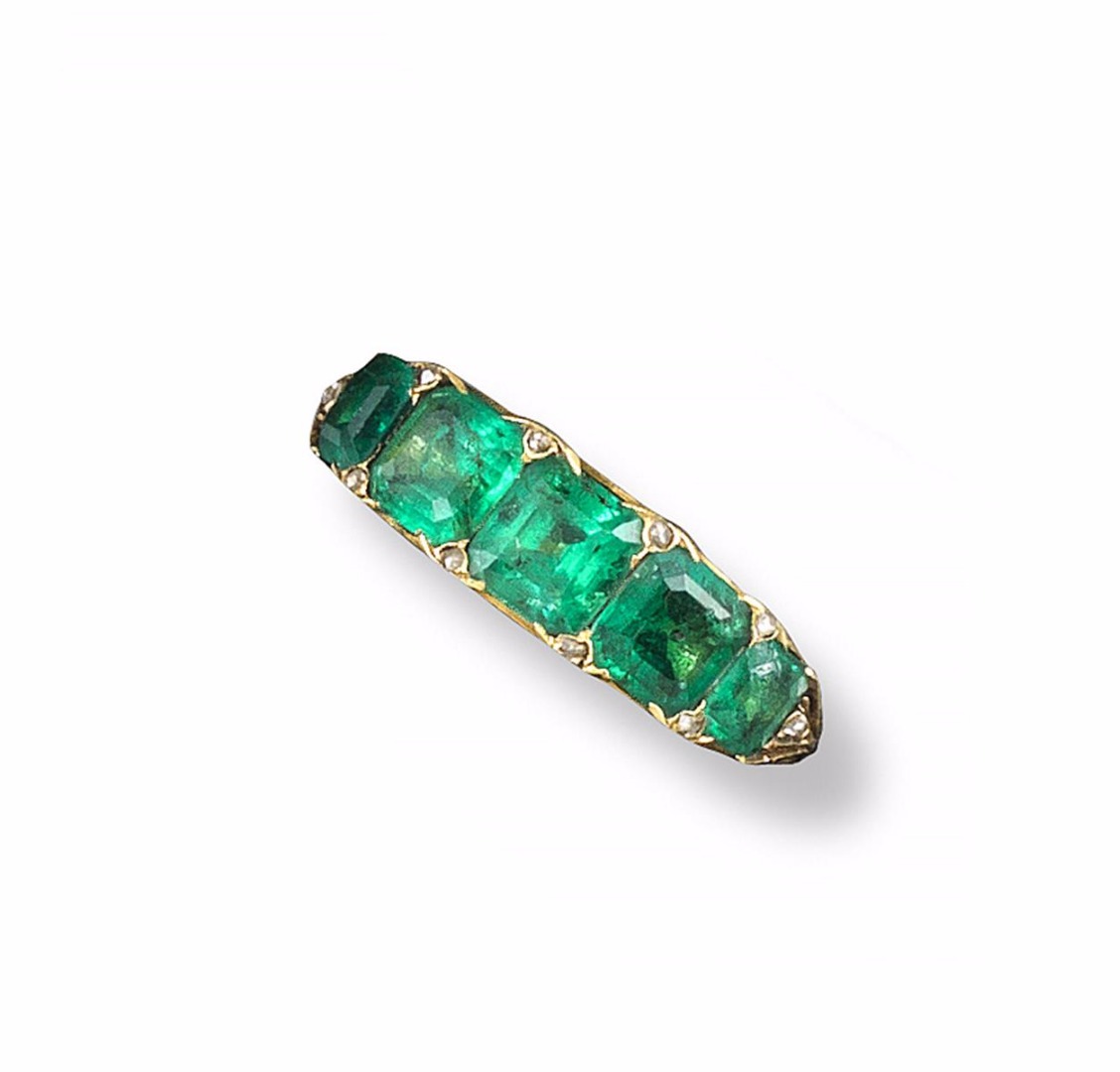 A late Victorian emerald five stone ring, the five graduated emerald-cut emeralds, with diamond pointers set in scroll-carved yellow gold shank. Size N 1/2.