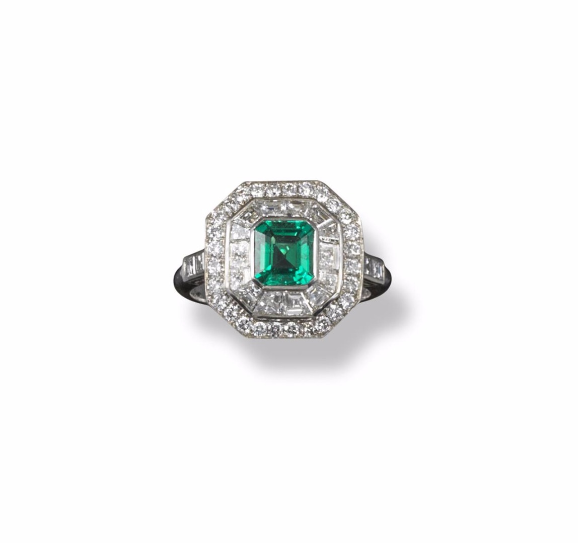 An emerald and diamond cluster ring, the emerald cut emerald is set within a surround of baguette and tapered baguette-shaped diamonds and a further surround of smaller round brilliant cut diamonds in white gold. Scroll engraved decoration to the shoulders which are each set with two further baguette shaped diamonds. Size M.