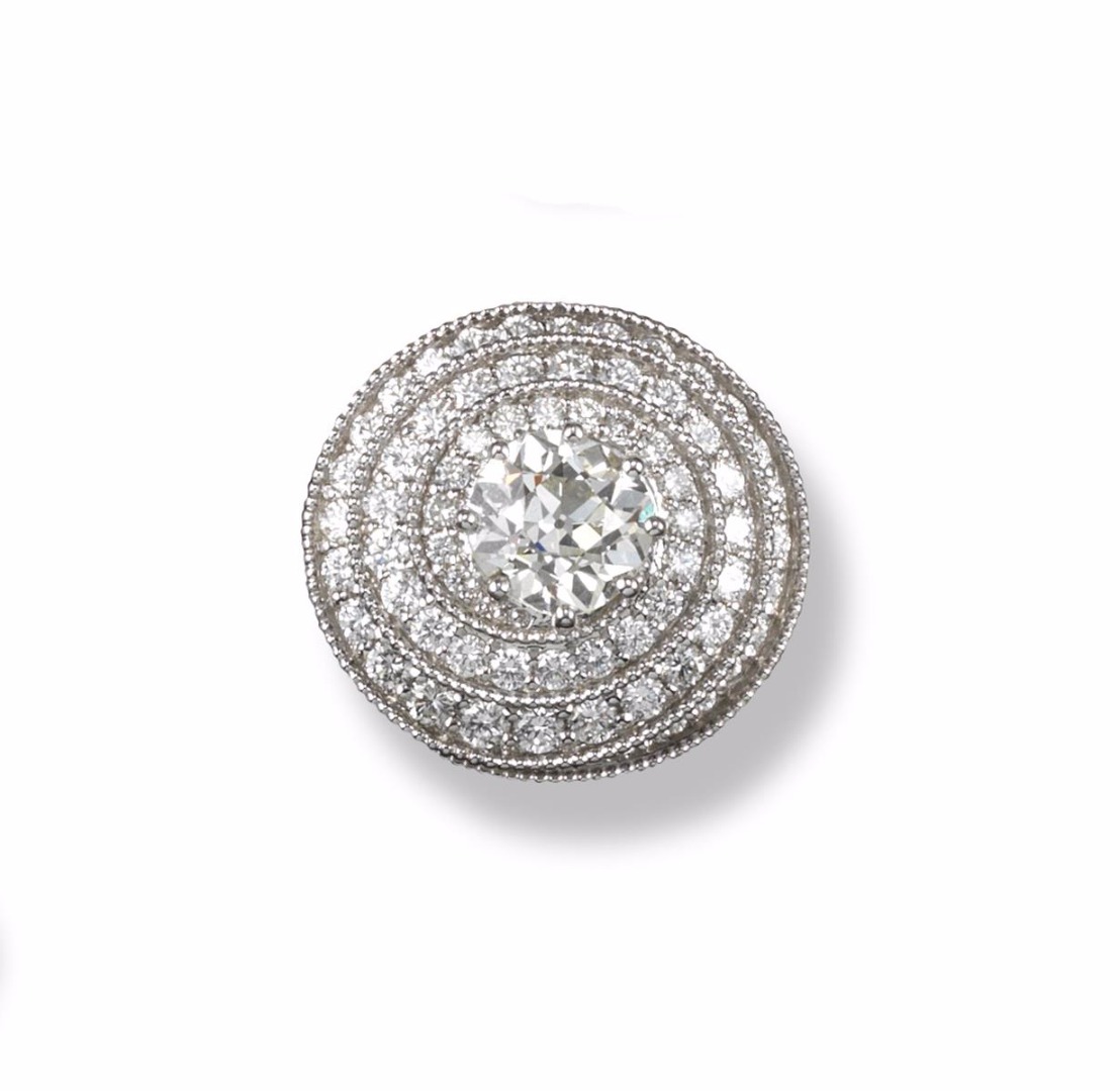 A diamond dress ring, set with an old circular-cut diamond which weighs approximately 2.65cts, within a millegrain-set spiral of circular-cut diamonds in white gold. Size R 1/2.