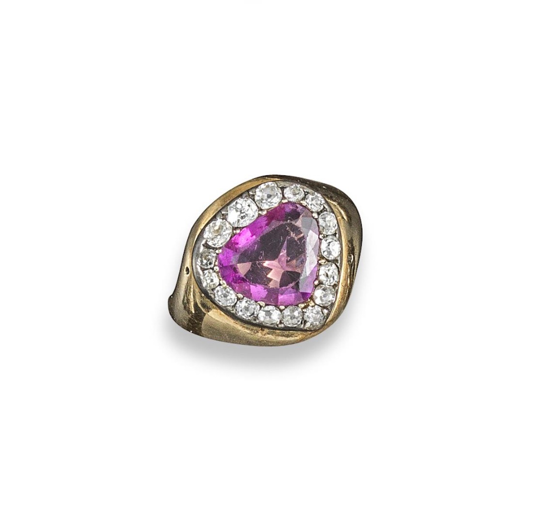 A Burmese sapphire and diamond cluster ring, the triangular pear-shaped pink sapphire is set within a surround of old cushion-shaped diamonds in silver collet and later yellow gold shank. Size O 1/2.