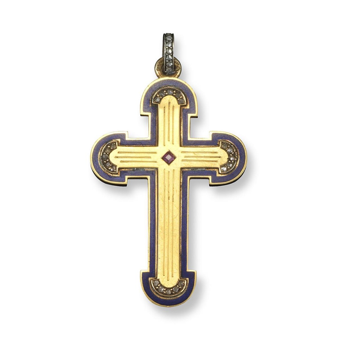 An enamel and gem-set cruciform pendant by Fabergé